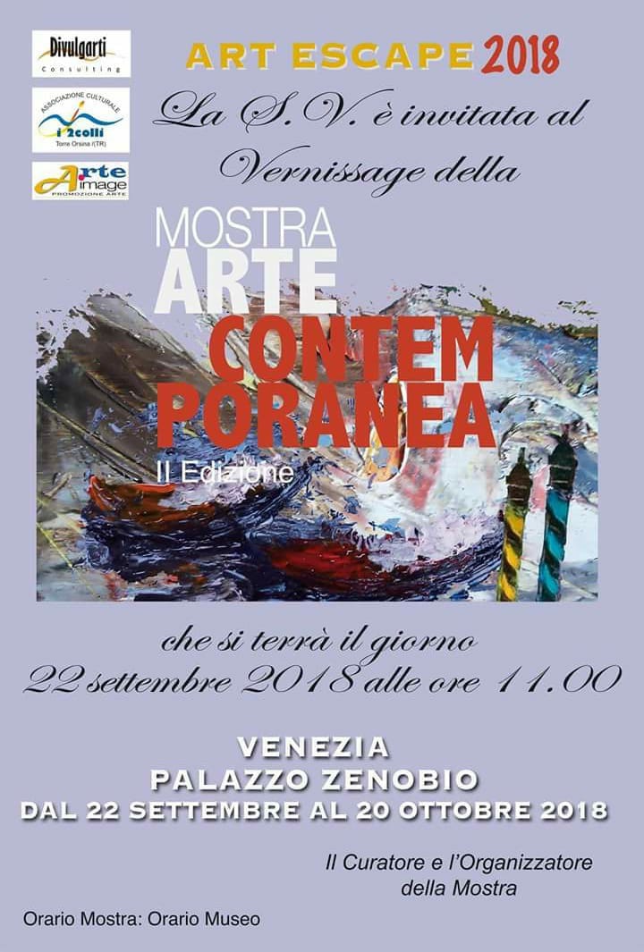 Il 22 settembre 2018 a Venezia presso Palazzo Zenobio dalle ore 11:00 si terrà l’inaugurazione della mostra d’arte contemporanea “ART ESCAPE 2018“. Presenterà la mostra il Dott. Angelo Bacci, direttore artistico, per più di 40 anni ha lavorato alla Biennale di Venezia, cultore dell’ Arte, poeta e scrittore.